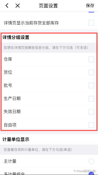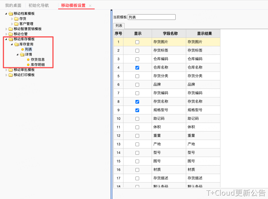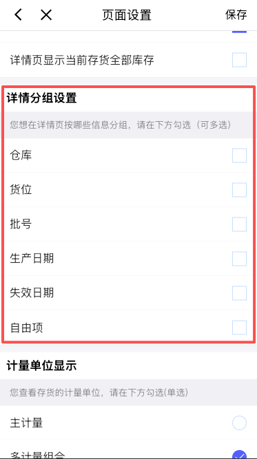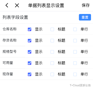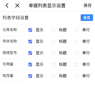 移动端可配置列表、详情页显示内容的配置。列表显示的可用量维度,即为列表查询可用量的分组维度。比如:列表显示仓库、存货、批号,则列表按照仓库+存货+批号分组取可用量,其中存货维度必勾选